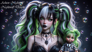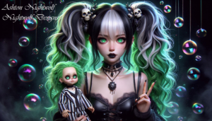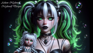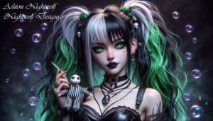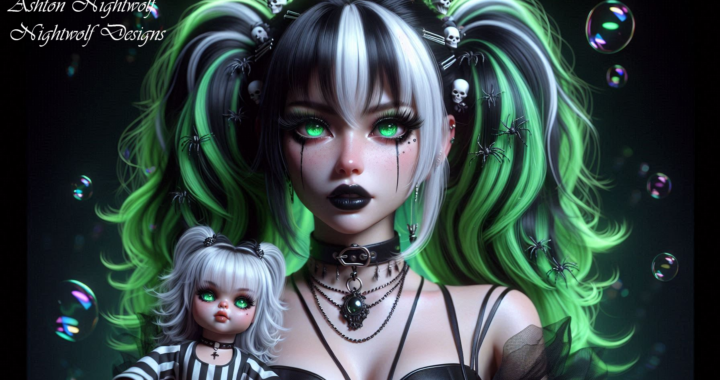 Anime Goth Girl Green & White with Doll AI Artwork