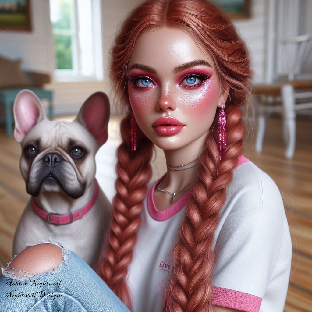 This Series features a Female. She has red hair and pink accents. She is with her French Bulldog near a farmhouse setting. This is for non commercial use without a commercial license A commercial license is available for purchase for each of the prints. 3 in a 8 series.