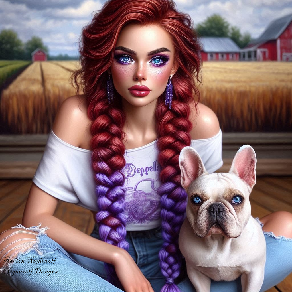 This Series features a Female. She has red hair and purple accents. She is with her French Bulldog near a farmhouse. This is for non commercial use without a commercial license A commercial license is available for purchase for each of the prints. 3 in a 8 series.