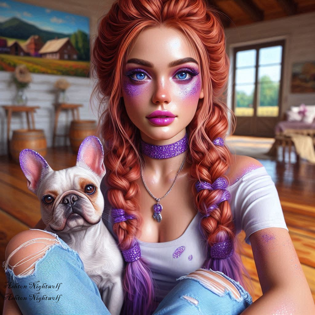 This Series features a Female. She has red hair and purple accents. She is with her French Bulldog near a farmhouse. This is for non commercial use without a commercial license A commercial license is available for purchase for each of the prints. 4 in a 8 series.