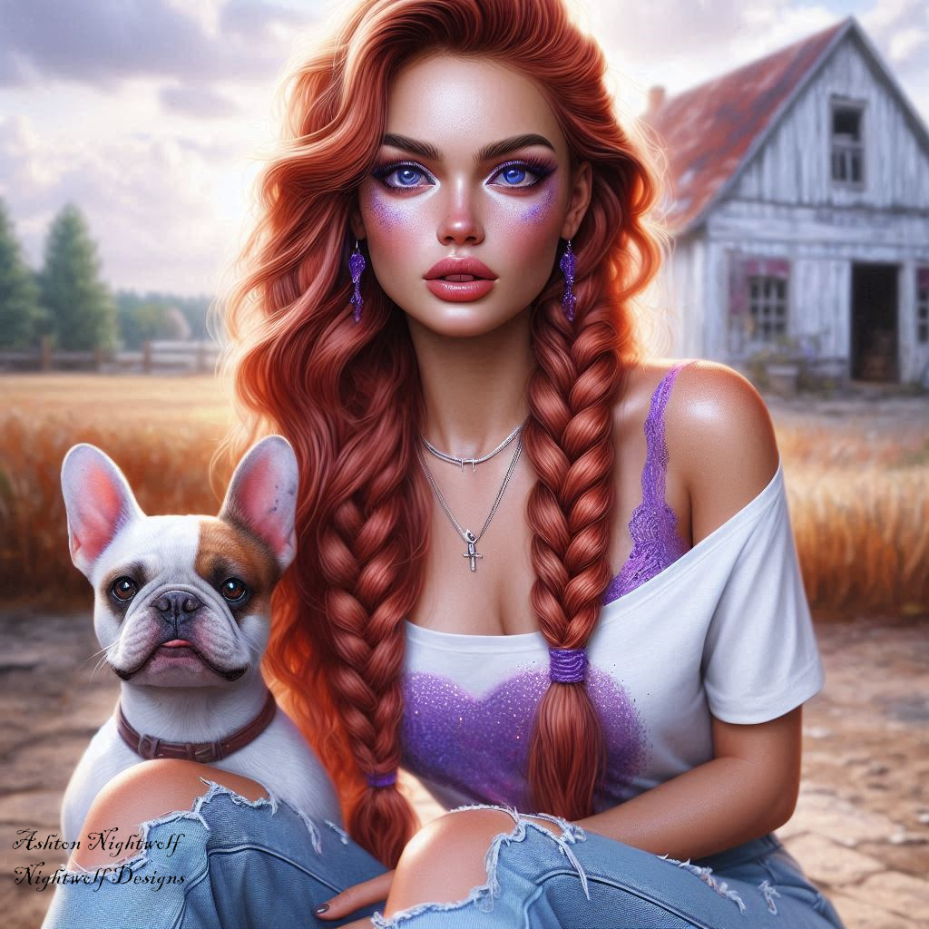 Female With Red Hair And Purple Accents With French Bulldog Near Farmhouse AI Artwork 5