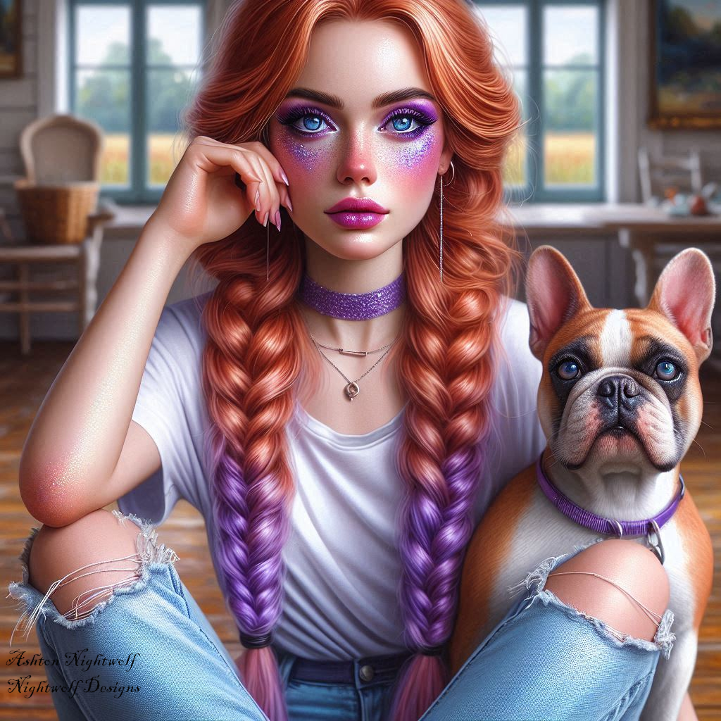 Female With Red Hair And Purple Accents With French Bulldog Near Farmhouse AI Artwork 8